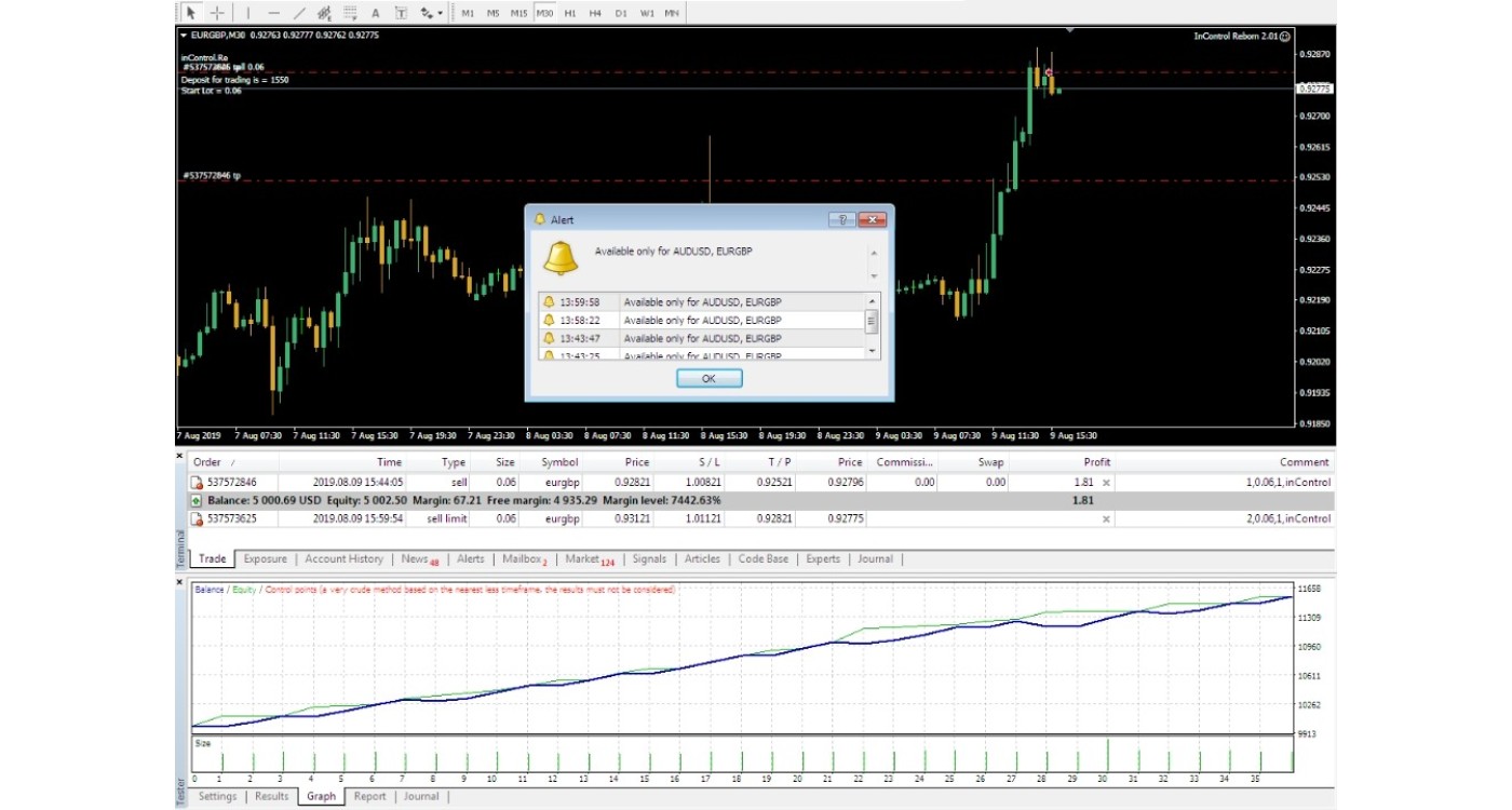 The algorithm of Forex inControl is so unique that the EA can easily work on many currency pairs. But we chose the two best ones. Trading on two currency pairs makes it possible to cover potential losses on one pair by the profit from trading on the other one. Such diversification allows to get a stable profit.