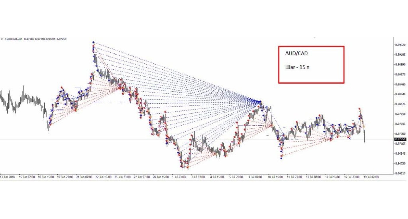 The principle of operation is based on the idea of bilateral trade using cross-rates, and avoids a lot of volatility and sharp price spikes in times of economic or political instability in the global financial markets. Below are graphical examples with "traces" of transactions on the chart.